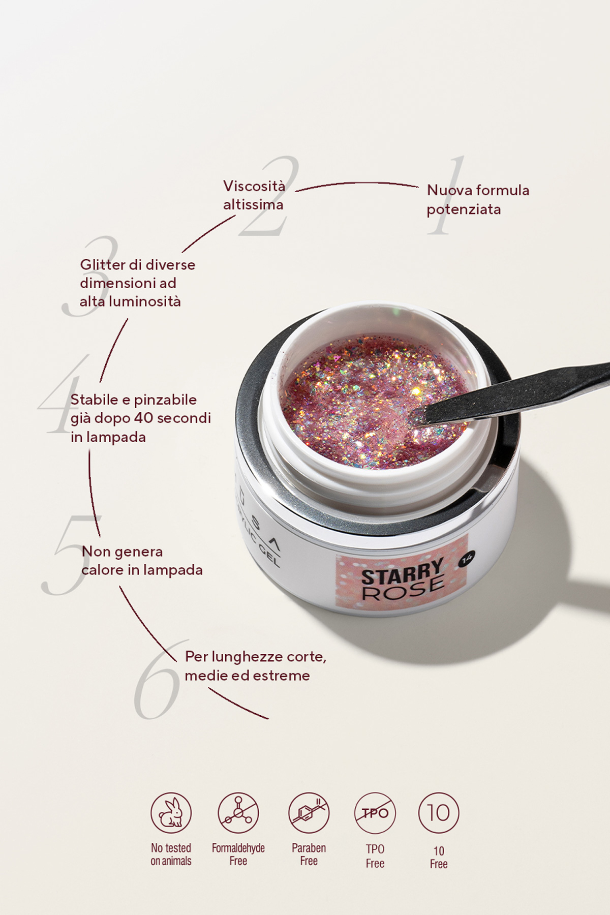 Acrylic Gel Starry è un acrylic gel glitterato di nuova generazione, arricchito da glitter di diverse dimensioni ad alta luminosità, che donano un effetto stellato per un risultato elegante, uniforme e altamente professionale.